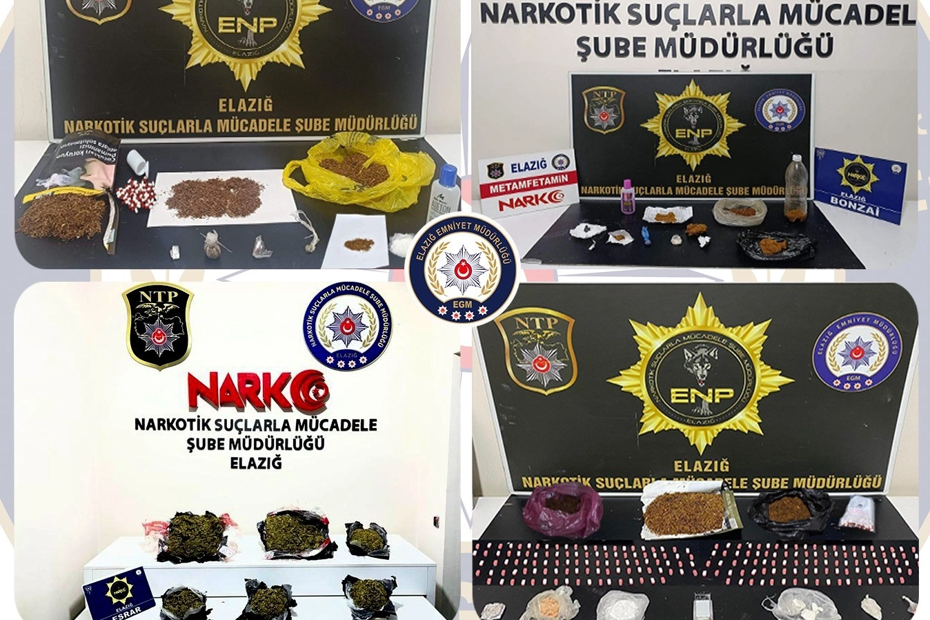 Elazığ Cumhuriyet Başsavcılığı koordinesinde, İl Emniyet Müdürlüğü Narkotik Suçlarla Mücadele ve Asayiş Şube Müdürlüğü ekiplerince uyuşturucu ile mücadele çalışmaları kapsamında son bir ay içerisinde, uyuşturucu madde kullanan ve ticaretini yapan şahıslara yönelik operasyonlar gerçekleştirildi. Yapılan baskınlarda 5 kilo 500 gram skunk maddesi, 2 kilo 324 gram sentetik kannobinoid maddesi, 909 gram kokain maddesi, 872 gram metamfetamin maddesi, 8 bin 752 adet sentetik ecza maddesi ve 4 adet hassas terazi ele geçirildi.
