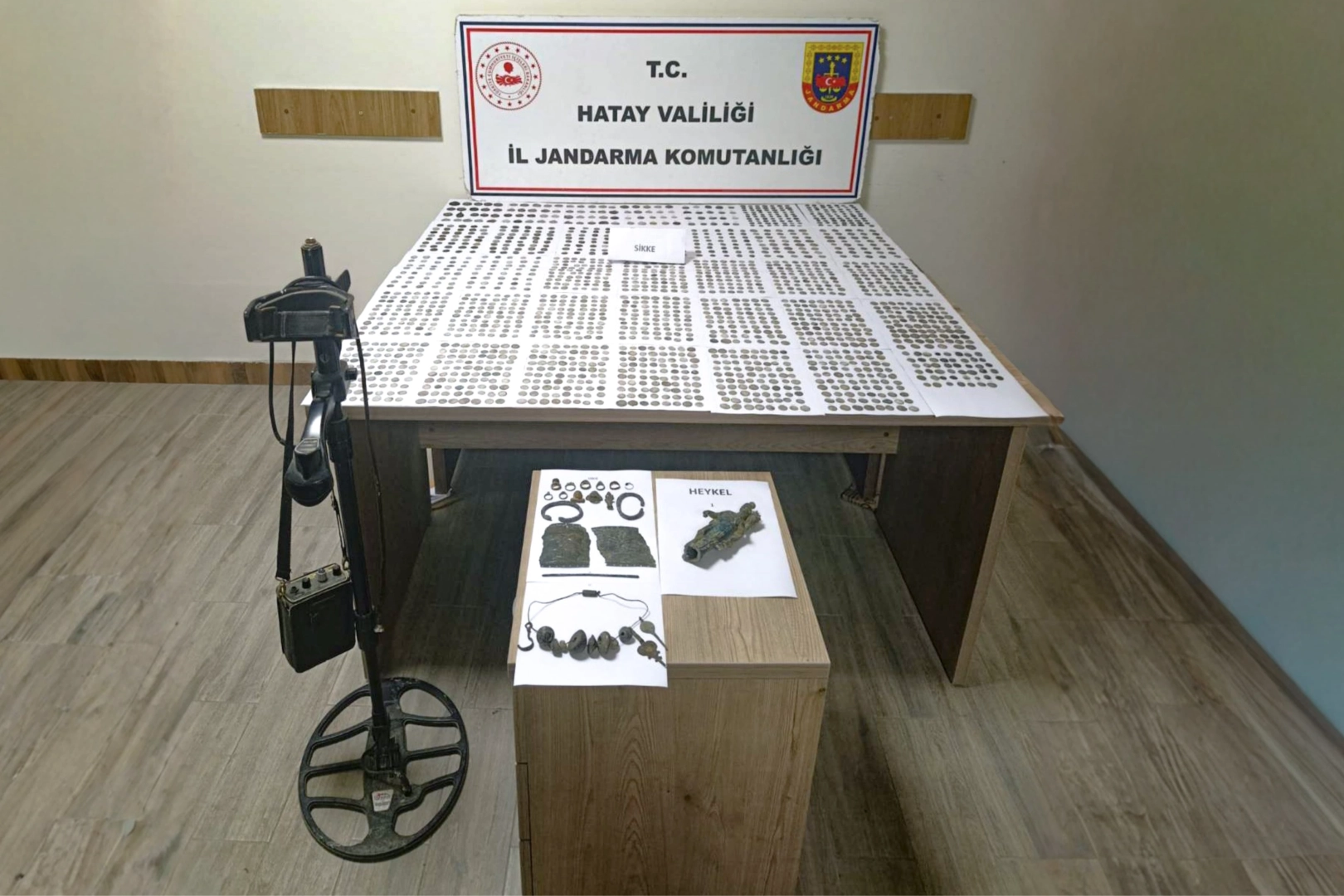 Hatay İl Jandarma Komutanlığı ekiplerince 18 Nisan tarihinde Antakya ilçesi Karlısu Mahallesi’nde A.A., S.G. ve A.A. isimli şahısların ikametlerinde yapılan aramada bin 988 adet çeşitli dönemlere ait olduğu değerlendirilen sikke,17 adet tarihi eser niteliği taşıyan obje, Roma dönemine ait olduğu değerlendirilen 1 adet heykel,1 adet dedektör ele geçirildi.