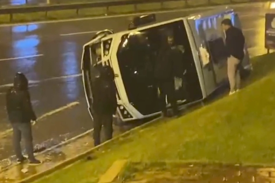 Kaza sonrası yaşananlar cep telefonu kamerasına yansıdı.Olay, gece saatlerine Maltepe'de D-100 karayolu üzerinde meydana geldi. İddiaya göre, şiddetli yağışın etkisiyle birlikte kaygan zeminde şoförünün direksiyonu hakimiyetini kaybettiği minibüs yan yattı. Kaza esnasında minibüsün içerisinde yolcu bulunmadığı öğrenildi. Kazayı gören çevredeki vatandaşlar minibüs şoförünün yardımına koştu. Kazada can kaybı ya da yaralanma yaşanmazken araçta maddi hasar oluştu. Yaşananlar vatandaşın cep telefonu kamerasına yansıdı.