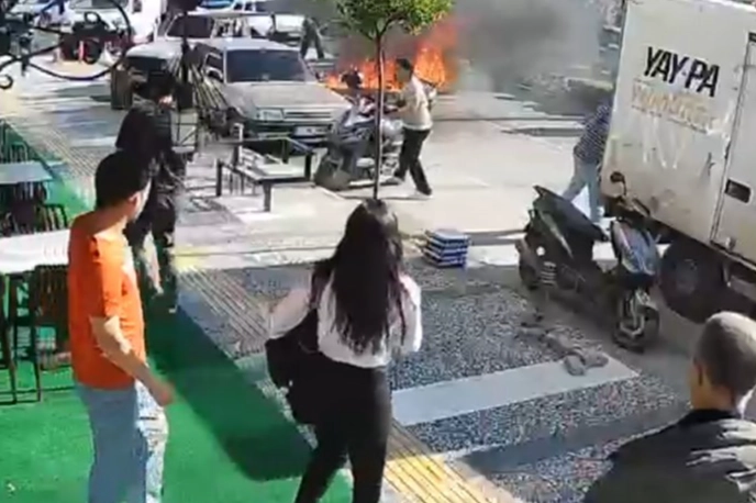 Antalya'nın Manavgat ilçesinde trafik ışıklarında bekleyen otomobilde bir anda patlama yaşandı. Kısa sürede alev topuna dönen araçtaki sürücü anne ile bebeği ve diğer yolcular kendilerini son anda dışarıya attı. Araç çevredekilerin yangın tüpleriyle müdahalesinin ardından söndürüldü.