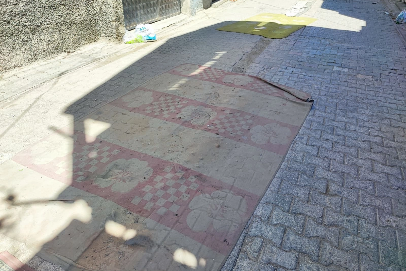 Mahalle bakkalı Kasım Yıldız ise, “Bu halıları sermezsek eşyalarımız ve dükkanımız toz içinde kalıyor. Mecburen bu yöntemi bulduk” sözleriyle durumu anlattı.