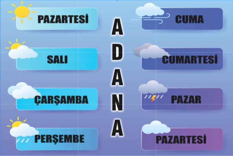 Bölge geneli açık, kuzey ilçelere dikkat!Adana genelinde sabah saatlerinden itibaren az bulutlu ve açık bir hava bekleniyor. Ancak öğleden sonra özellikle Adana ve Mersin’in kuzey kesimleri ile Kahramanmaraş’ın batı bölgelerinde yerel olarak sağanak ve gök gürültülü sağanak yağış görülebilir. Vatandaşların ani bastırabilecek yağışlara karşı hazırlıklı olması öneriliyor.