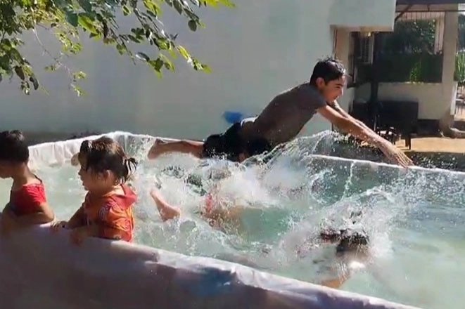 Baba Eroğlu, "Hava aşırı sıcak olduğu için deniz de çok sıcaktı. Bu nedenle çocuklar denize girmek istemedi. Ben de römorku havuza çevirdim. Çocuklar bu havuzda yüzüp serinliyor. Hava çok sıcak" dedi.