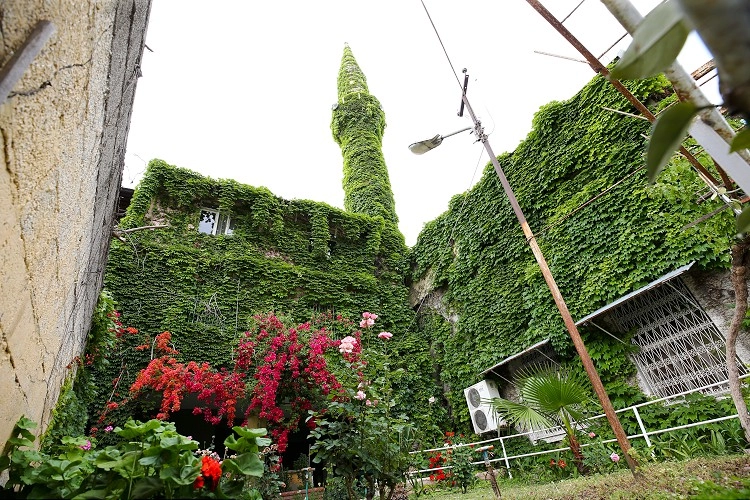 Yaklaşık 280 farklı bitki türünün bulunduğu cami bahçesi, görenleri hayran bırakıyor. Asırlık sarmaşıkların 1983 yılında dikildiği belirtilirken, minareyi tamamen saran bu yeşillik camiyi adeta çam ağacına benzetiyor. Bahar aylarında yeşile bürünen yapı, yaz boyunca da bu görünümünü koruyor.