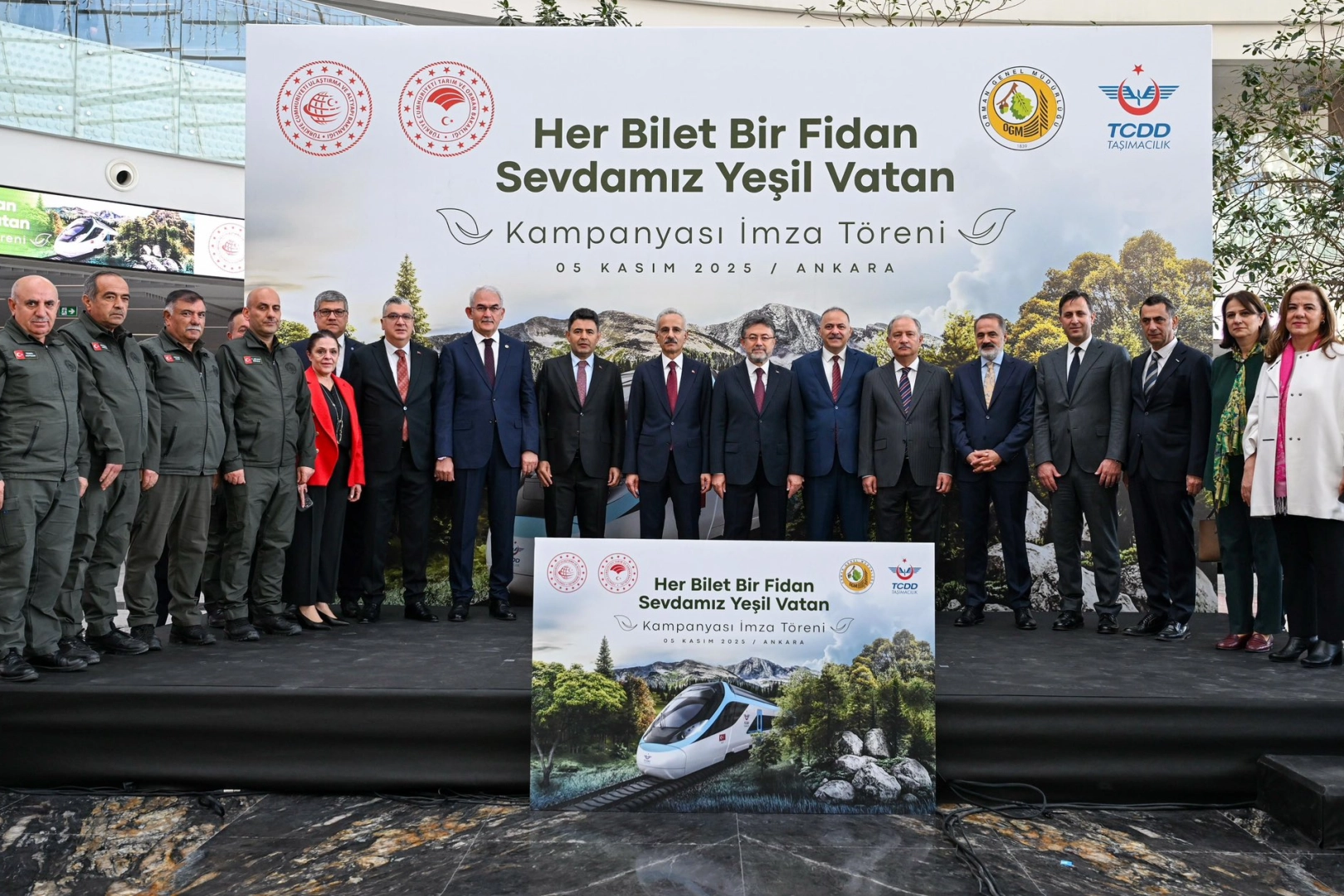 Ulaştırma ve Altyapı Bakanlığı ile Tarım ve Orman Bakanlığı, “Her Bilet Bir Fidan Sevdamız Yeşil Vatan Kampanyası” protokolü için imza töreni düzenledi. Bakan Uraloğlu, 11 Kasım 2025 – 11 Kasım 2026 tarihleri arasında Yüksek Hızlı Trenler ile seyahat eden her yolcu adına bir fidan dikileceğini belirterek, yıllık ortalama 13 milyon yolcunun 13 milyon fidanı toprakla buluşturacağını açıkladı.