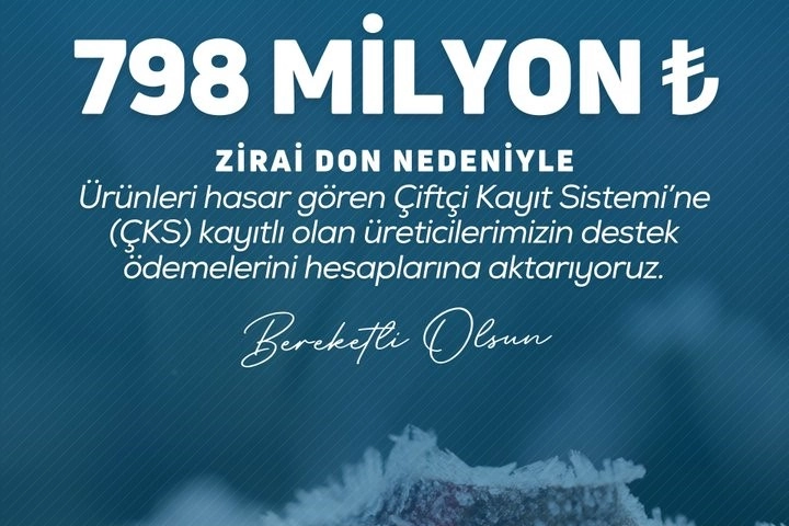 Bakan Yumaklı sosyal medya hesabından yaptığı açıklamada, "Zirai don nedeniyle ürünleri hasar gören Çiftçi Kayıt Sistemi’ne (ÇKS) kayıtlı olan üreticilerimize önceki ödemelerin devamı olarak 798 milyon lira destek ödemesini de çiftçilerimizin hesaplarına aktarıyoruz. Böylece toplamda 22 milyar 946 milyon lira zirai don desteği üreticilerimizin hesaplarına aktarılmış oldu. Zirai don kapsamında üreticilerimize destek ödemelerine devam edeceğiz" ifadelerini kullandı.