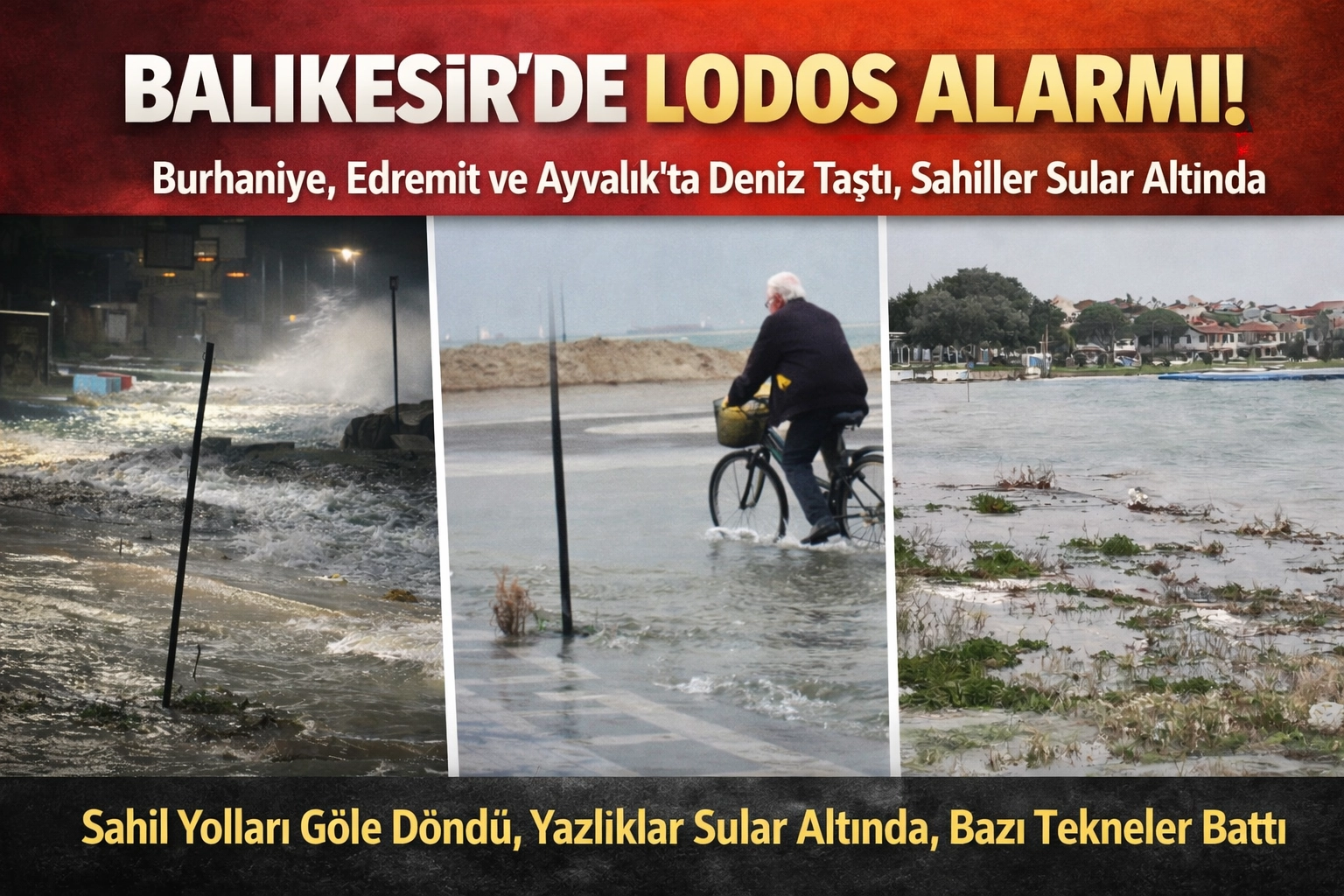 Burhaniye’de sahil Venedik’i andırdıBurhaniye ilçesinde özellikle Ören ve Öğretmenler Mahallesi’nde taşan deniz, plajı aşarak yerleşim alanlarına ulaştı. Kabaran dalgalar sahil yollarını göle çevirirken, bazı yazlık evler su altında kaldı. Ortaya çıkan manzara Venedik’i andıran görüntülere sahne oldu.