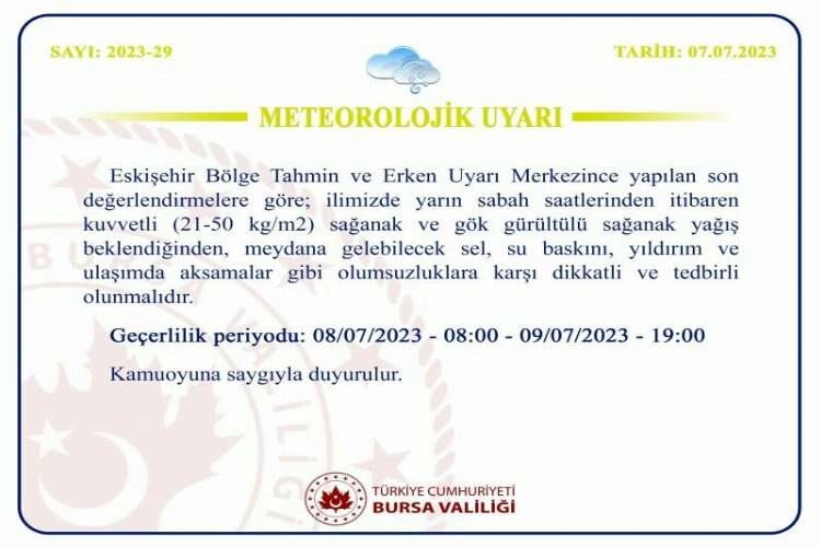 Bursa Valiliği gök gürültülü sağanak yağışın etkili olacağını konusunda vatandaşlara uyardı. Yarın sabah 08.00’dan başlayıp pazar günü saat 19.00’a kadar sürmesi beklenen uyarı da şu ifadelere yer verildi; "Eskişehir Bölge Tahmin ve Erken Uyarı Merkezince yapılan son değerlendirmelere göre, ilimizde yarın sabah saatlerinden itibaren kuvvetli 21 ile 50 kilogram metrekare sağanak ve gök gürültülü sağanak yağış beklendiğinden, meydana gelebilecek sel, su baskını, yıldırım ve ulaşımda aksamalar gibi olumsuzluklara karşı dikkatli ve tedbirli olunmalıdır."