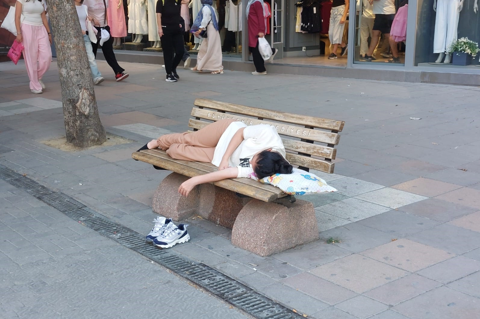 Sıcaklıkların artmasıyla bunalan vatandaşlar serinlemek ve dinlenmek için farklı yollar arıyor. Eskişehir’de 2 Eylül Caddesi üzerindeki tramvay durağı arkasında bulunan bankta, gençlerden biri kafasının altına yastığını koyarak uyudu. Çevreden geçen vatandaşlar bu durumu hayretle karşılarken, banktan uzak noktalardan geçip uyuyan genci rahatsız etmemeye çalışması dikkati çekti.