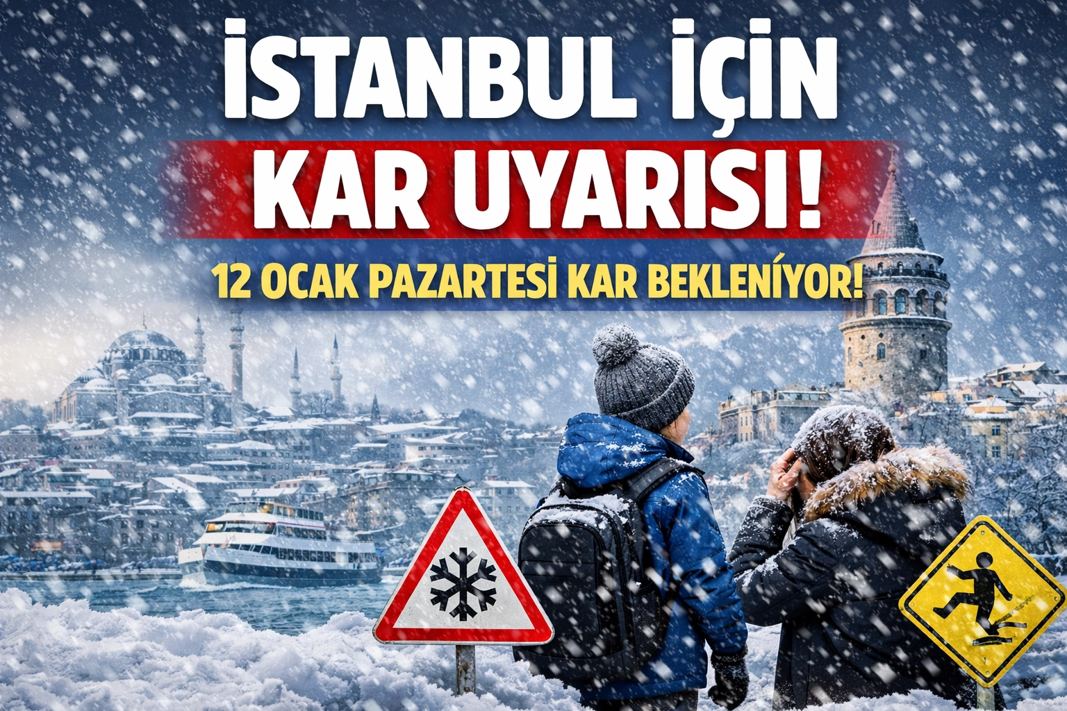 METEOROLOJİ’DEN İSTANBUL İÇİN KAR UYARISIMeteoroloji uzmanlarının paylaştığı son hava durumu raporlarına göre, kar yağışının 12 Ocak Pazartesi günü İstanbul genelinde etkili olması bekleniyor. Özellikle gece saatlerinden itibaren sıcaklıkların hızla düşeceği, şehir merkezinde dahi kar tutma ihtimalinin bulunduğu belirtiliyor.