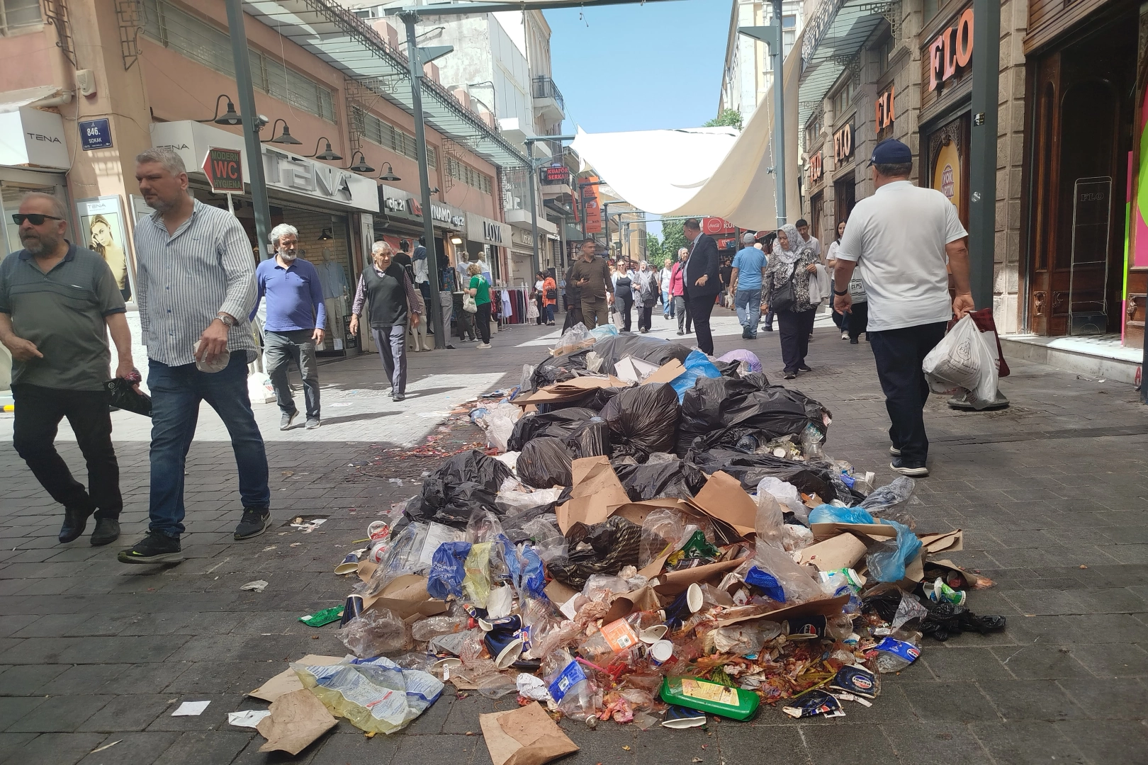 Konak Belediyesi işçilerinin toplu iş sözleşmesi görüşmelerinde anlaşma sağlanamaması üzerine dün başlattığı grev, ilçede hayatı olumsuz etkiledi. Grevin ilk gününde temizlik hizmetlerinin tamamen durması nedeniyle başta Tarihi Kemeraltı Çarşısı olmak üzere pek çok mahalle ve sokakta çöp dağları oluştu. Kötü koku ve çevre kirliliği vatandaşlar ve turistlerin tepkisini çekerken, esnaf ise çöplerin üzerini naylonla örterek çare aradı.