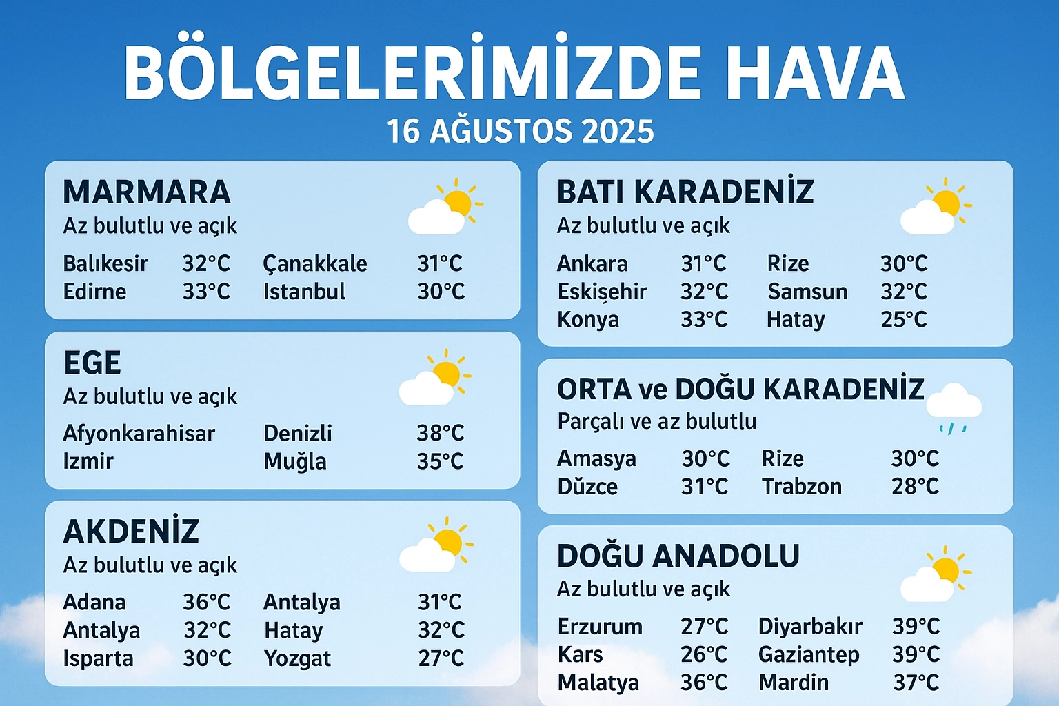 Bölgelerimizde hava durumu – 16 Ağustos 2025: Marmara BölgesiBölge genelinde az bulutlu ve açık bir hava bekleniyor. Kuzey ve kuzeydoğu yönlerinden kuvvetli rüzgâr, kısa süreli fırtına (50-70 km/saat) şeklinde esecek.