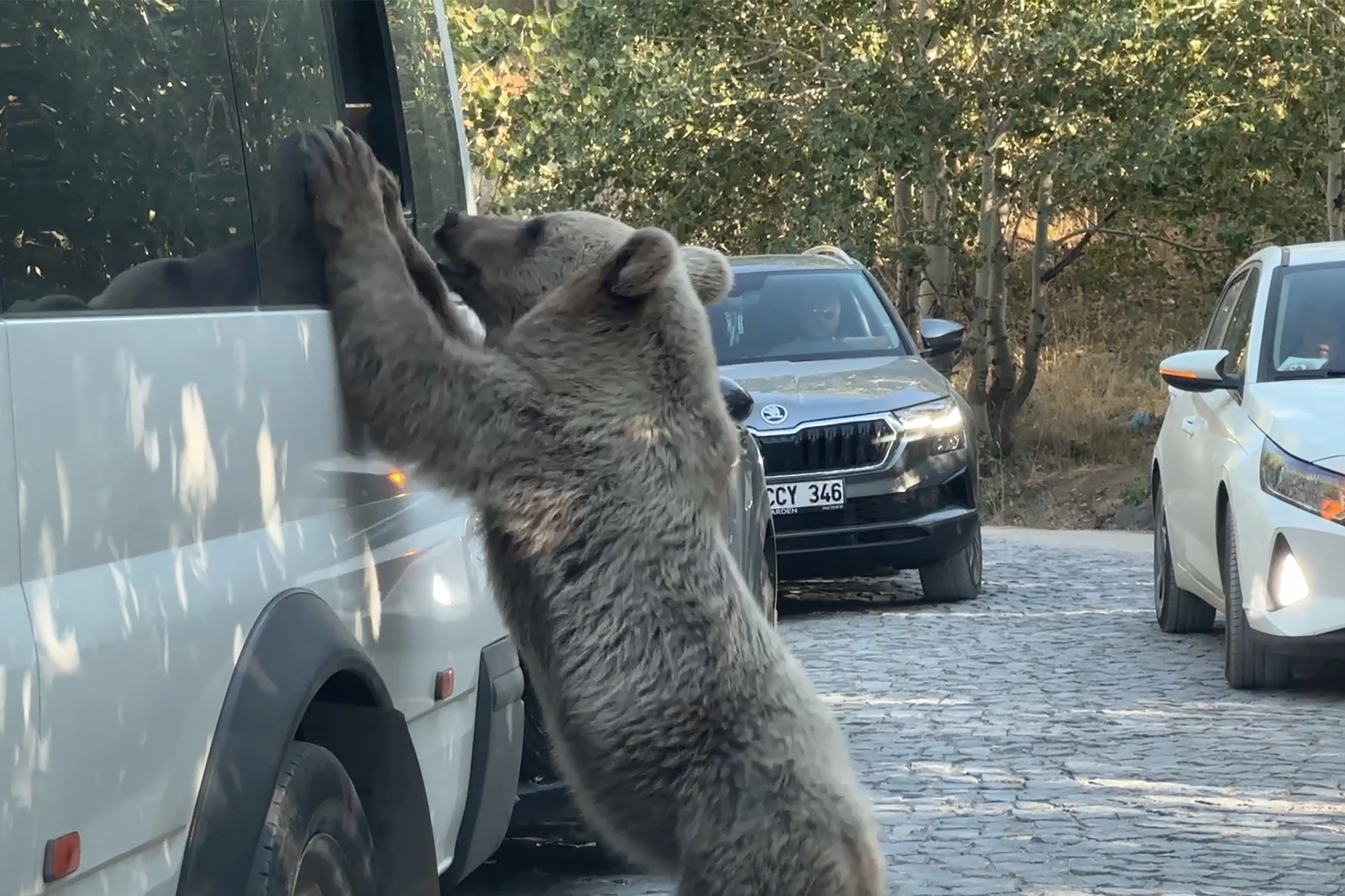 Bitlis’in Ahlat, Güroymak ve Tatvan ilçe sınırları içinde bulunan Nemrut Krater Gölü çevresini gezmeye giden bir vatandaş, gölde yiyecek arayan boz ayılarla karşılaştı. Aracının camından ayıya ekmek uzatmak isteyen kişi, aniden ayının saldırısına uğradı. Saldırıdan son anda kurtulan vatandaşın o anları, çevrede bulunan diğer kişiler tarafından cep telefonu kameralarına kaydedildi.Nemrut Krater Gölü çevresinde sık sık görülen ayıların yabani yaşam alanında beslenmesinin hem insanlar hem de hayvanlar için tehlikeli olduğunu vurgulayan yetkililer, vatandaşların yabani hayvanlara yaklaşmaması ve yiyecek vermemesi konusunda uyarıda bulundu.