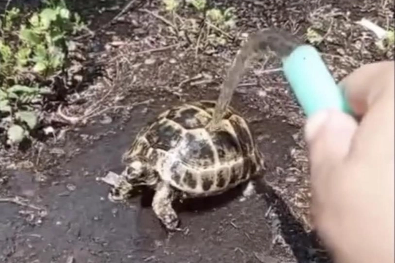 Osmaniye'nin Karaçay Mahallesi'nde bir vatandaş, evinin bahçesinde hareketsiz halde bir yavru kaplumbağa gördü. Sıcaklığın 45 dereceyi bulduğu merkezde güneşin altında kalan kaplumbağanın susadığını düşünen hayvansever, önce hortumla su içirdi, ardından kaplumbağanın üzerine su tutarak serinlemesini sağladı. O anları cep telefonu kamerasıyla görüntüleyerek yaplaşan vatandaş büyük takdir topladı.