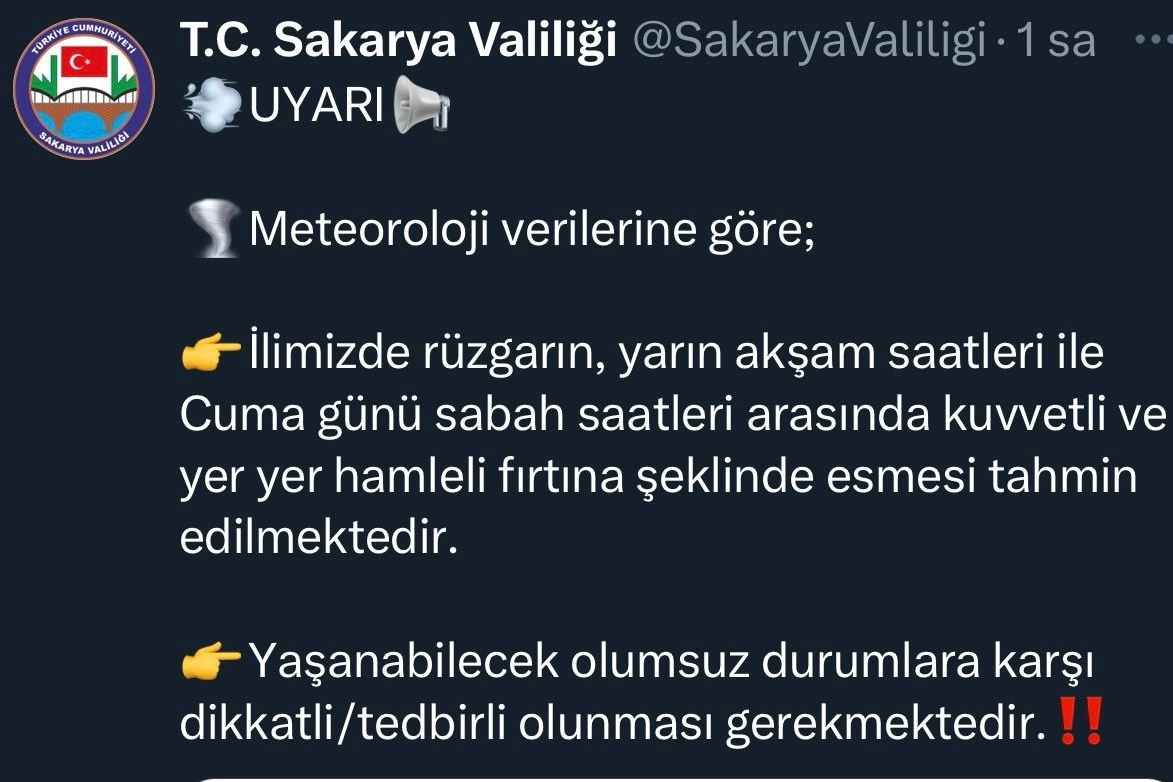 Meteoroloji Genel Müdürlüğü’nden elde edilen bilgilerin neticesinde Sakarya Valiliği, sosyal medya hesabı üzerinden yarın akşam ile Cuma günü sabah saatleri arasında etkili olması beklenen kuvvetli fırtınaya karşı vatandaşları uyardı. Yaşanabilecek olumsuz durumlara karşı Valiliğin sosyal medya hesabından yapılan paylaşımda, “Yapılan son değerlendirmelere göre; rüzgarın, yarın (Perşembe) akşam saatleri ile Cuma (19.01.2024) günü sabah saatleri arasında bölgemizde güney ve güneybatı yönlerden kuvvetli ve yer yer hamleli fırtına (50-80 km/saat) şeklinde esmesi beklendiğinden ağaç ve direk devrilmesi, çatı uçması, soba ve baca gazı kaynaklı zehirlenme riski gibi olumsuzluklara karşı dikkatli ve tedbirli olunması gerekmektedir” denildi.