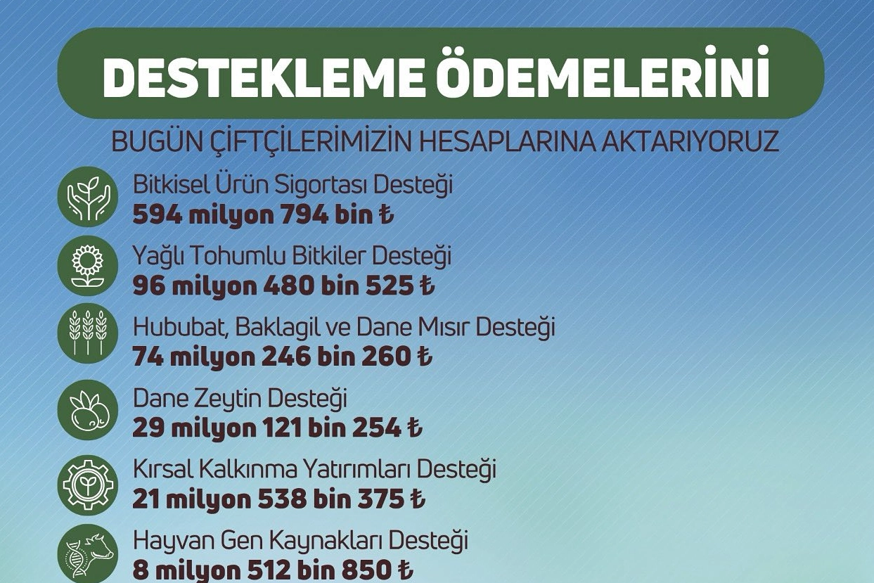 Tarım ve Orman Bakanlığı, toplam 826 milyon 825 bin lira tutarındaki tarımsal destekleme ödemesinin bugün itibarıyla çiftçilerin hesaplarına aktarılacağını açıkladı. Yapılacak ödemeler kapsamında, bitkisel ürün sigortası desteği için 594 milyon 794 bin lira, yağlı tohumlu bitkiler desteği için 96 milyon 480 bin lira ve hububat, baklagil ile dane mısır desteği için 74 milyon 246 bin lira ödeme yapılacak. Ayrıca dane zeytinyağı desteği kapsamında 29 milyon 538 bin lira, kırsal kalkınma yatırımları desteği için 21 milyon 538 bin lira ve hayvan gen kaynakları desteği kapsamında 8 milyon 512 bin lira çiftçilerin hesaplarına aktarılacak. Mazot ve gübre desteği için 1 milyon lira, geleneksel zeytin bahçelerinin rehabilitasyonu desteği kapsamında ise 659 bin liralık ödeme gerçekleştirilecek.