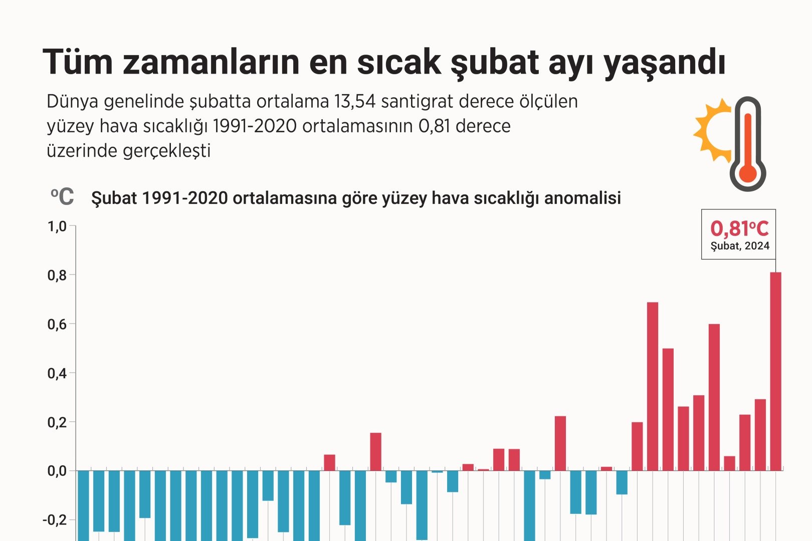 Bu ölçüm, şubat ayı için 1991-2020 yılları ortalamasının 0,81 derece, 2016'da kaydedilen bir önceki en sıcak şubat ayının da 0,12 derece üzerinde oldu.