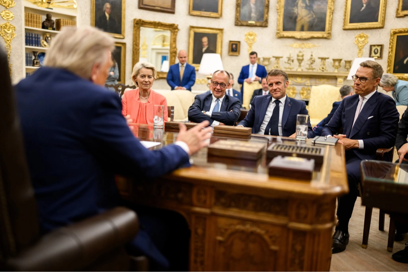 ABD Başkanı Donald Trump, Ukrayna Devlet Başkanı Vladimir Zelenskiy, Avrupa Birliği (AB) Komisyonu Başkanı Ursula von der Leyen, NATO Genel Sekreteri Mark Rutte, Almanya Başbakanı Friedrich Merz, Fransa Cumhurbaşkanı Emmanuel Macron, İtalya Başbakanı Giorgia Meloni, Finlandiya Cumhurbaşkanı Alexander Stubb ve İngiltere Başbakanı Keir Starmer, Rusya-Ukrayna Savaşı’na ilişkin başlıkları tartışmak için Beyaz Saray’da bir araya geldi. Liderlerin görüşmesi sonrasında ilk sözü alan Trump, "Sizi burada ağırlamak büyük bir onur. Burası özel bir yer. Beyaz Saray, nereden gelirseniz gelin çok şey ifade eden ve gerçekten çok güzel bir yer. Bugün gerçekleşen tüm harika şeyler için teşekkür ederim. Ukrayna’daki katliamları sona erdirmek ve savaşı durdurmak için önemli görüşmeler yaptık. Hepimiz aynı amaç için çalışıyoruz: Çok basit bir amaç, öldürmeyi durdurmak, bu sorunu çözmek istiyoruz. Bir veya iki hafta içinde bir anlaşmaya varabiliriz. Bu korkunç savaşı sonlandırabileceğimize inanıyorum. Ben bu katliama son vermek istiyorum. Çok sayıda insan ölüyor ve onları kurtarmalıyız. Kurtarmalıyız. Hepimiz kalıcı bir barış için çalışırken acil bir ateşkesin olmasını tercih ederim" dedi.