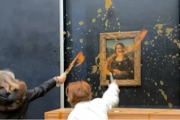 Fransa'nın Paris şehrindeki Louvre Müzesi'nde camla korunan Mona Lisa tablosuyeni bir eylemin kurbanı oldu. "Tarım sistemimiz hasta" diyerek "sağlıklı ve sürdürülebilir gıda" hakkı talep eden iki protestocu tabloya çorba fırlattı.Leonardo da Vinci'nin 16. yüzyılda yaptığı Mona Lisa tablosu dünyanın en ünlü sanat eserlerinden biri ve Paris'teki Louvre'da sergileniyor.