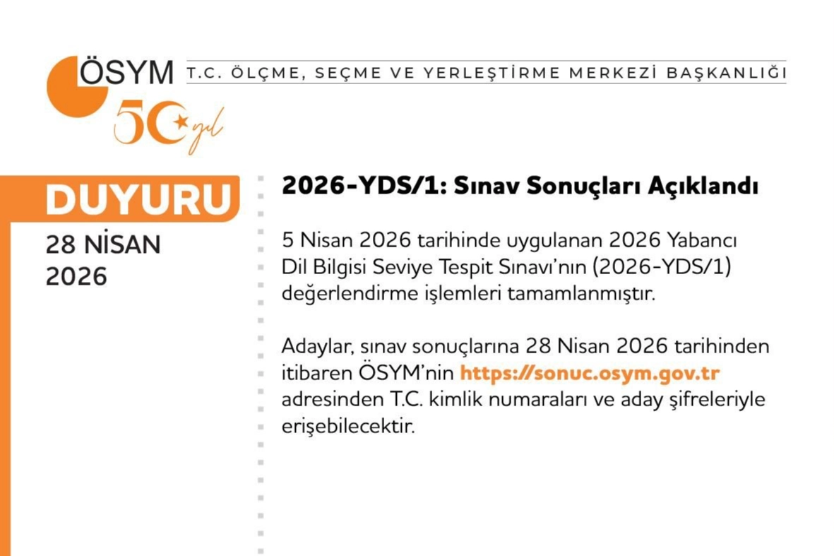 Ölçme, Seçme ve Yerleştirme Merkezi (ÖSYM), Yabancı Dil Seviye Tespit Sınavı'nın (YDS) açıklandığını duyurdu. ÖSYM tarafından yapılan açıklamada, "5 Nisan tarihinde uygulanan 2026 Yabancı Dil Bilgisi Seviye Tespit Sınavı'nın (2026-YDS/1) değerlendirme işlemleri tamamlanmıştır. Adaylar, sınav sonuçlarına 28 Nisan tarihinden itibaren ÖSYM'nin https://sonuc.osym.gov.tr adresinden T.C. kimlik numaraları ve aday şifreleriyle erişebilecektir" ifadelerine yer verildi.