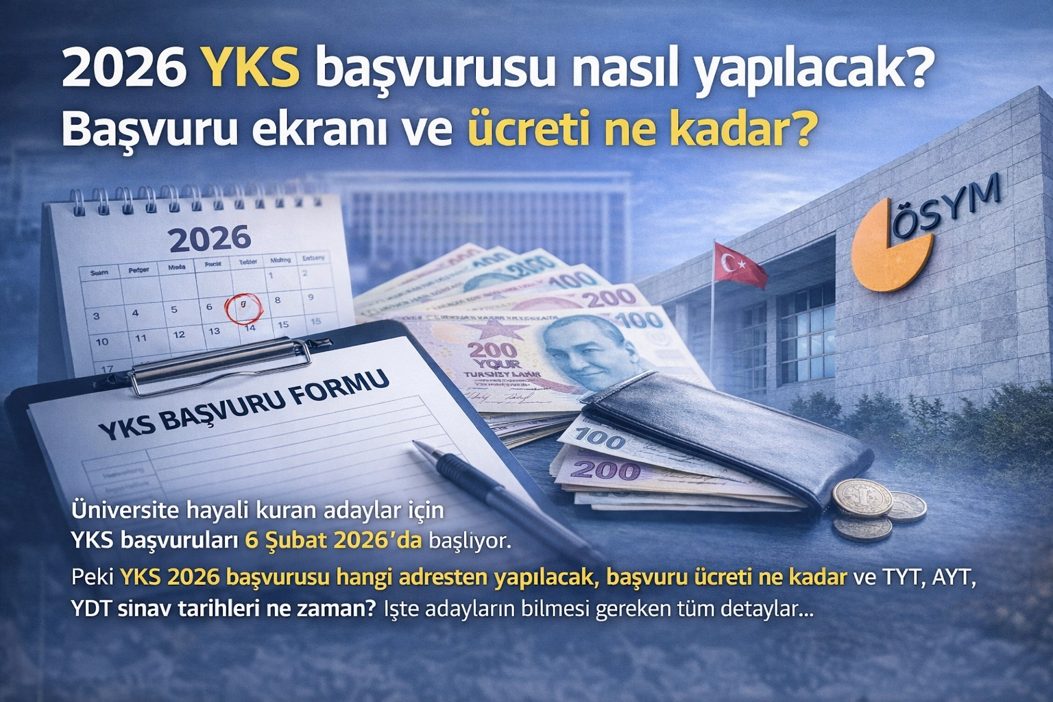 Üniversite hedefleyen adaylar için YKS başvuruları başlıyor! 6 Şubat 2026 tarihinde ÖSYM’nin Aday İşlemleri Sistemi (AİS) üzerinden yapılacak YKS başvuruları, TYT, AYT ve YDT oturumlarını kapsıyor. Peki 2026 YKS başvurusu nasıl yapılacak, başvuru ücreti ne kadar, sınav tarihleri ne zaman? İşte tüm detaylar…