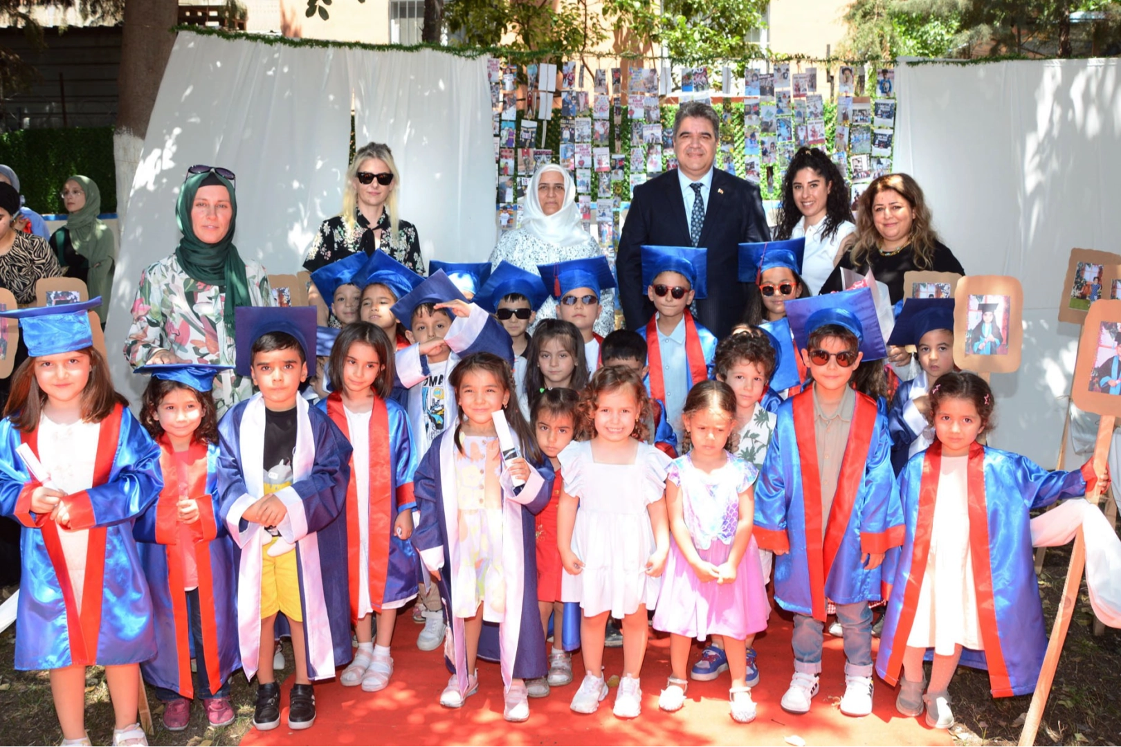 Miniklerin mezuniyet belgelerinin Adana Eczacı Odası Başkanı Ecz. Ö. Mürsel Yalbuzdağ, YK Üyesi Ecz. Melika Şahindal Bayer ve Okul Müdürü Nadire Bilgiç tarafından verilmesinin ardından belgelerini alan minikler keplerini havaya fırlatarak mezun olmanın sevincini yaşadılar.