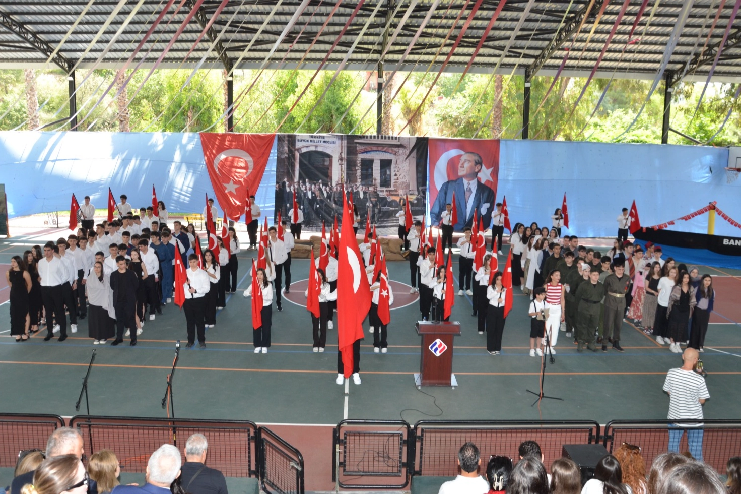 Dumanı tüten Bandırma Vapuru eşliğinde “Mustafa Kemal’den Mektup Var “ tiyatro gösterisini sahneleyen öğrencilerin performansları göz doldurdu. Özellikle Hasan Tahsin’in ilk kurşununu sahneleyen gençler izleyenleri duygulandırdı. İzmir Marşı’nın seslendirilmesinin ardından öğrencilerin İstiklal Marşı’nın 10 kıtasını büyük bir coşkuyla okuması büyük bir gururdu. Zeybek, Vals Dansı sonrası gençlerin sahaya “Ne Mutlu Türküm Diyene” yazılı pankartlarla çıkması tam bir görsel şölen oluşturdu.