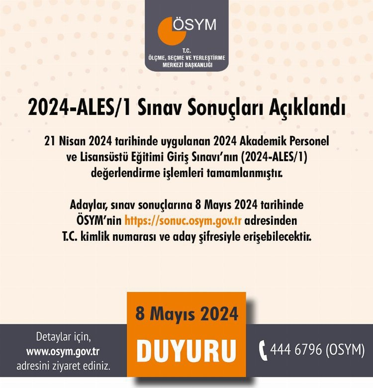 Adaylar, sınav sonuçlarına 08 Mayıs 2024 tarihinde saat 15.00’ten itibaren ÖSYM’nin https://sonuc.osym.gov.tr adresinden T.C. kimlik numarası ve aday şifresiyle erişebilecektir.