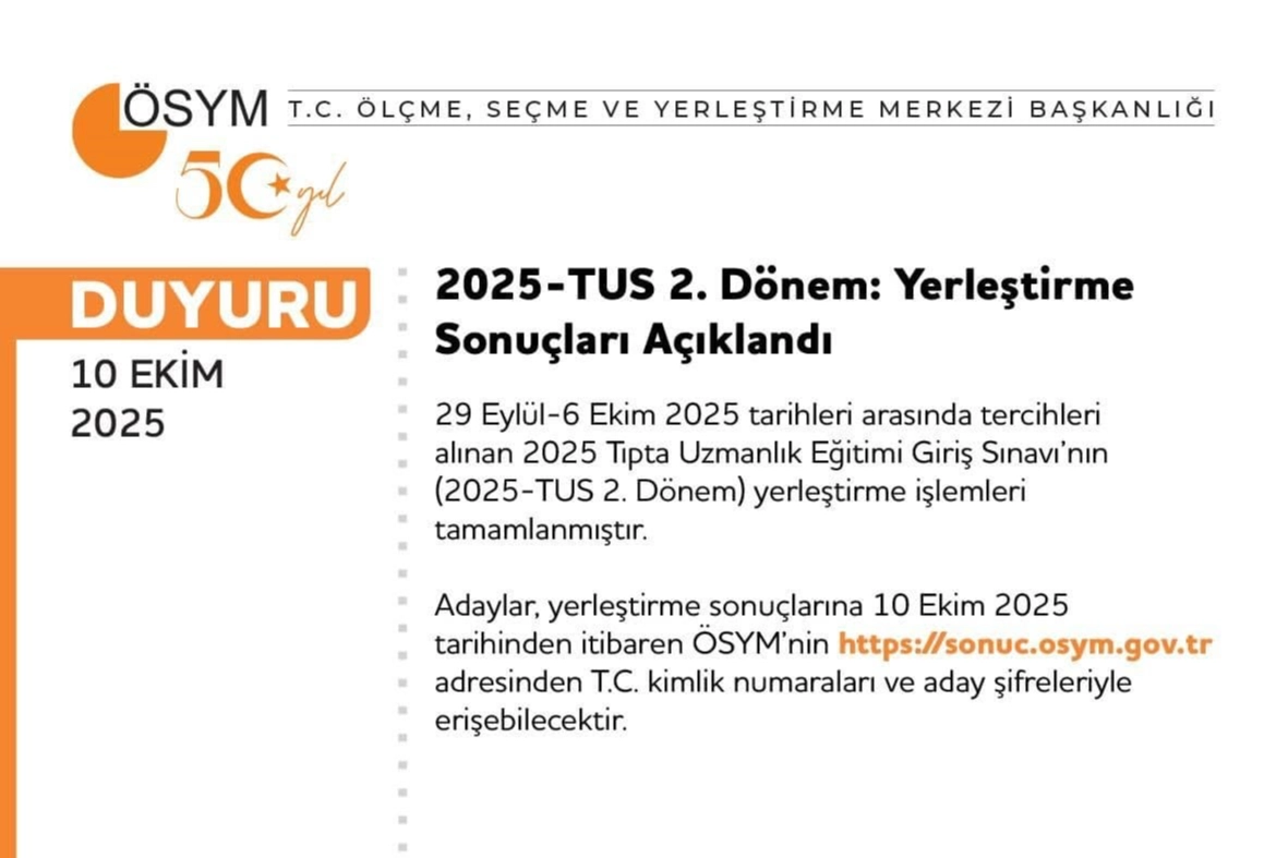Öğrenci Seçme ve Yerleştirme Merkezi (ÖSYM), Tıpta Uzmanlık Eğitimi Giriş Sınavı'nın (TUS) 2'nci Dönem Yerleştirme Sonuçları'nın açıklandığını duyurdu. ÖSYM tarafından yapılan yazılı açıklamada, 2025-TUS 2. Dönem Yerleştirme Sonuçları'nın ÖSYM'nin resmi sitesinden T.C. kimlik numarası ve aday şifresiyle erişime açıldığı belirtildi. ÖSYM, konuya ilişkin yaptığı açıklamada şu ifadelere yer verdi: "2025-TUS 2. Dönem Yerleştirme Sonuçları açıklandı. 29 Eylül-6 Ekim 2025 tarihleri arasında tercihleri alınan 2025 Tıpta Uzmanlık Eğitimi Giriş Sınavı'nın (2025-TUS 2. Dönem) yerleştirme işlemleri tamamlanmıştır. Adaylar, yerleştirme sonuçlarına 10 Ekim 2025 tarihinden itibaren ÖSYM'nin https://sonuc.osym.gov.tr adresinden T.C. kimlik numaraları ve aday şifreleriyle erişebilecektir."