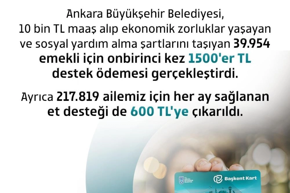 Ankara Büyükşehir Belediyesi, zorlu ekonomik şartlar altında yaşayan emeklilere yönelik desteklerini sürdürüyor. Emeklilere on birinci kez 1500 TL destek ödemesi yaparken, ayrıca 217 bin 819 aileye her ay sağlanan et desteği de 600 TL'ye çıkarıldı.