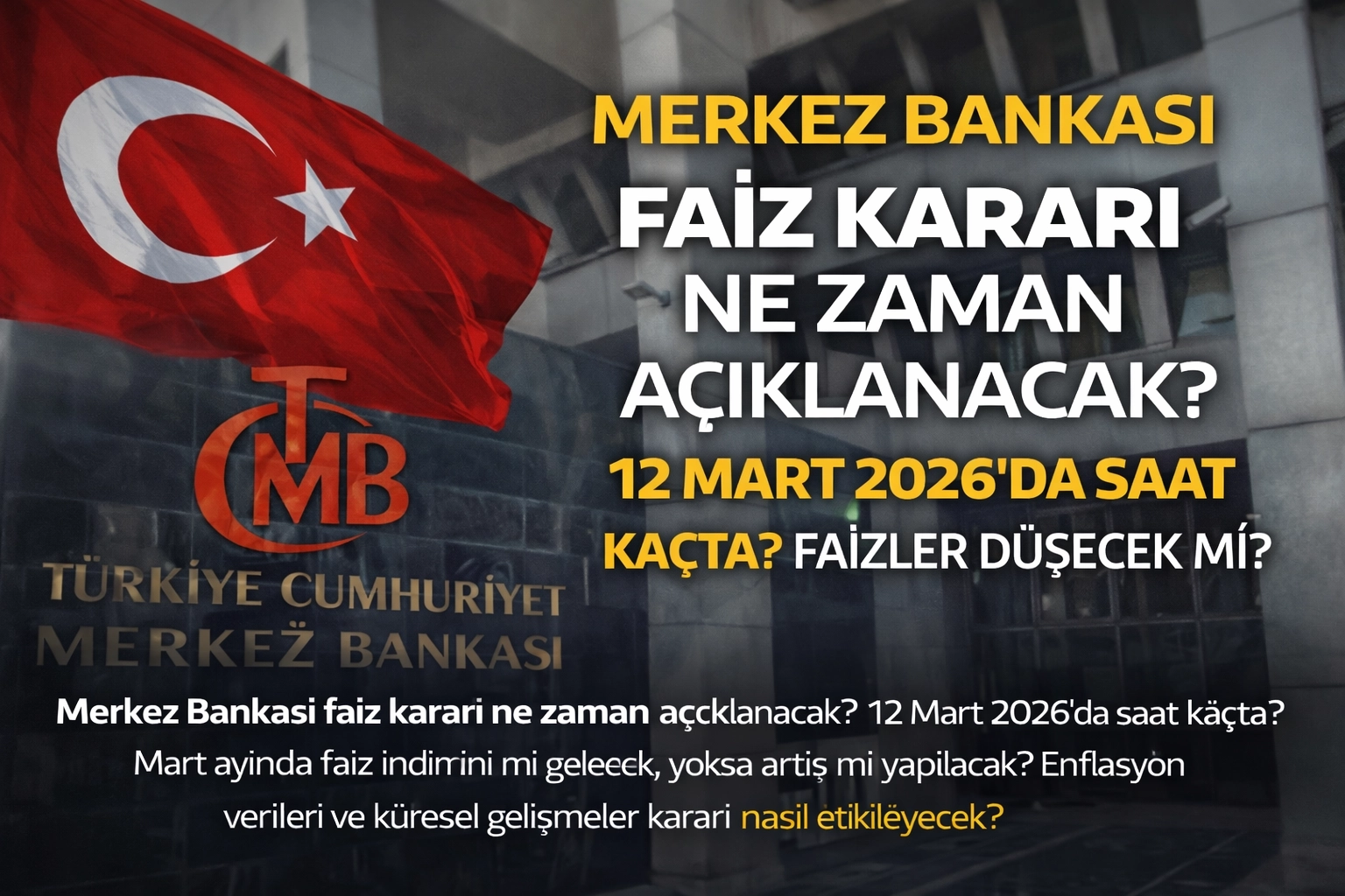 MERKEZ BANKASI FAİZ KARARI NE ZAMAN?Türkiye Cumhuriyet Merkez Bankası (TCMB), yılın ikinci Para Politikası Kurulu (PPK) toplantısını 12 Mart 2026 tarihinde gerçekleştirecek.Faiz kararı ise aynı gün saat 14.00’te kamuoyuna duyurulacak.