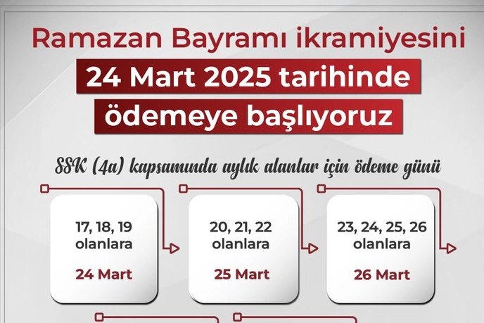 Emekli Sandığı emeklilerine ise bayram ikramiyesi ödemeleri, nisan dönemi aylıklarıyla birlikte 28 Mart 2025 tarihinde yatırılacak.