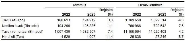 TÜİK'in açıklamasına göre, Temmuz ayında tavuk yumurtası üretimi, bir önceki yılın aynı ayına göre %7,4 arttı. Tavuk eti üretimi %3,3 ve kesilen tavuk sayısı %1,1 artarken; hindi eti üretimi %11,4 azaldı. Ocak-Temmuz döneminde ise tavuk yumurtası üretimi %4,2 artarken; tavuk eti üretimi %4,3, kesilen tavuk sayısı %7,5 ve hindi eti üretimi %8,7 azaldı.