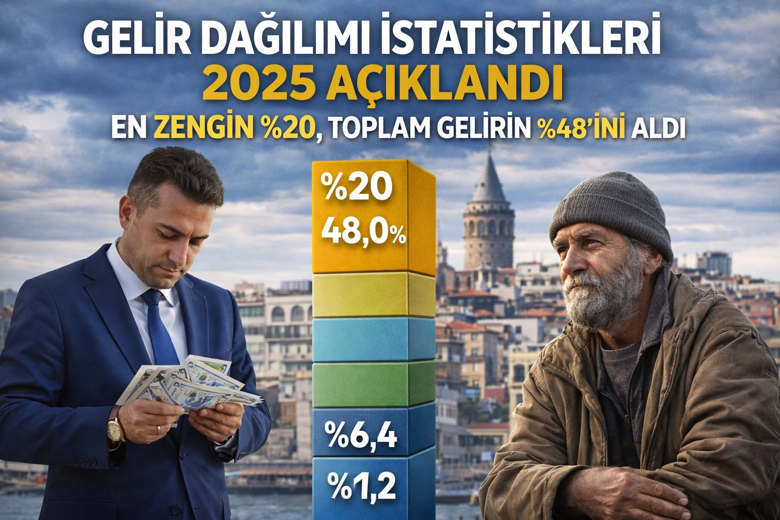 Gelir ve Yaşam Koşulları Araştırması 2025 sonuçlarına göre, en yüksek eşdeğer hanehalkı kullanılabilir fert gelirine sahip %20’lik grubun toplam gelirden aldığı pay bir önceki yıla göre 0,1 puan azalarak %48,0 oldu. En düşük gelire sahip %20’lik grubun payı ise 0,1 puan artışla %6,4 olarak hesaplandı.