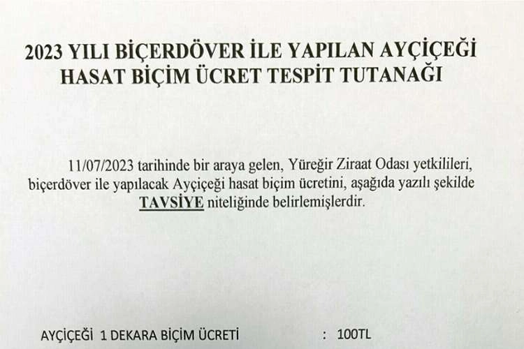 11/07/2023 tarihinde bir araya gelen, Yüreğir Ziraat Odası yetkilileri 2023 yılı biçerdöver ile bir dekar Ayçiçeği hasat biçim ücretini 100 (Yüz) TL olarak tavsiye niteliğinde belirledi.