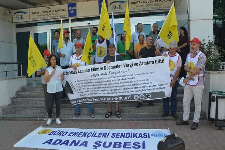 Büro Emekçileri Sendikası (BES) Adana Şubesi üyeleri Adana SGK İl Müdürlüğü önünde basın açıklaması yaptı. Açıklamayı BES Adana Şube Başkanı Fatma Sarıoğuz Güney okudu. Güney, maaş zamları ve son dönemde yaşanan zar furyasını değerlendirdi.