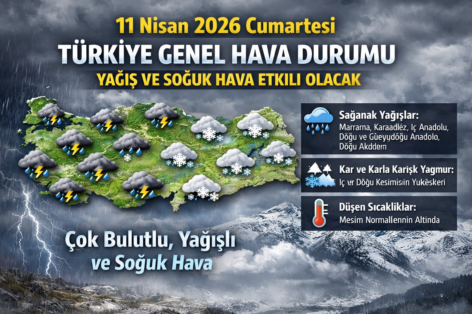Çok bulutlu, aralıklı yağmur ve karla karışık yağmurlu
