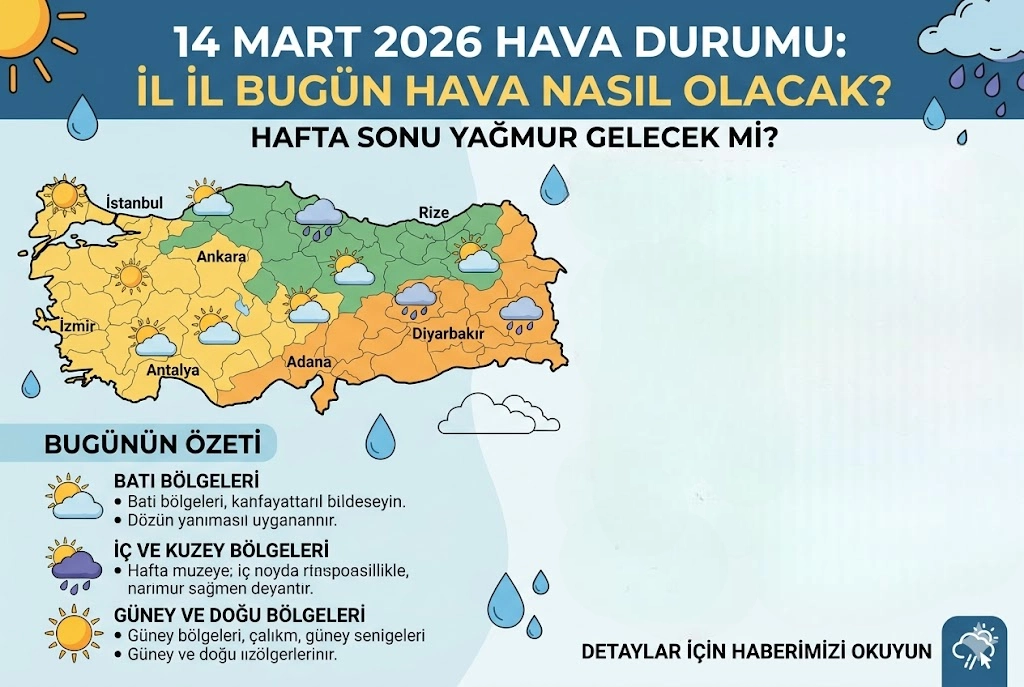 METEOROLOJİ’DEN İL İL HAVA DURUMU UYARISIMeteoroloji Genel Müdürlüğü’nün son raporuna göre, 14 Mart 2026 Cumartesi günü Türkiye genelinde hava durumu mevsim normallerinde olacak. Güney ve doğu kesimlerinde yer yer çok bulutlu hava, Doğu Anadolu’nun doğusu ve bazı yüksek kesimlerde karla karışık yağmur bekleniyor.