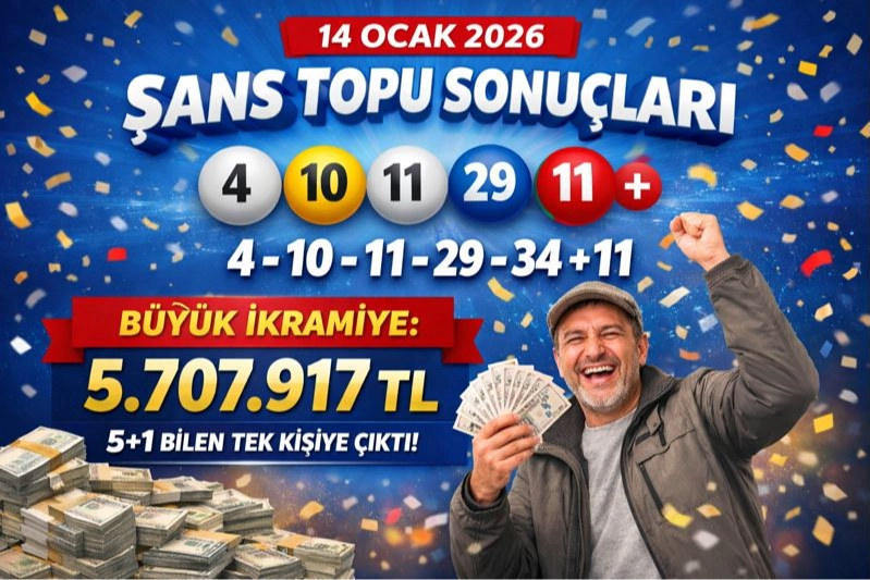 14 OCAK 2026 ŞANS TOPU SONUÇLARI 14 OCAK 2026 TARİHİNDE YAPILAN ÇEKİLİŞ SONUÇLARINA GÖRE:5+1 bilen: 1 kişi – 5.707.917 TL