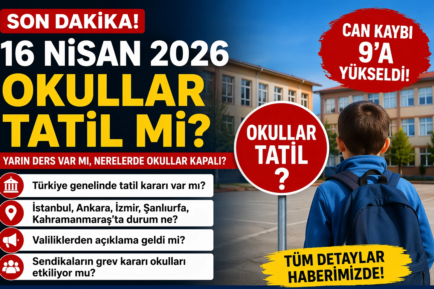 Türkiye, 16 Nisan 2026 Perşembe günü okulların tatil olup olmadığı sorusuna kilitlendi. Özellikle Kahramanmaraş’ta yaşanan ve ülke gündemini sarsan olay sonrası “yarın okullar tatil mi?” sorusu milyonlarca öğrenci ve veli tarafından araştırılıyor.Son dakika gelişmeleriyle birlikte valiliklerden ve Milli Eğitim Bakanlığı’ndan gelecek resmi açıklamalar yakından takip edilirken, eğitim sendikalarının aldığı iş bırakma kararları da gündemi hareketlendirdi.