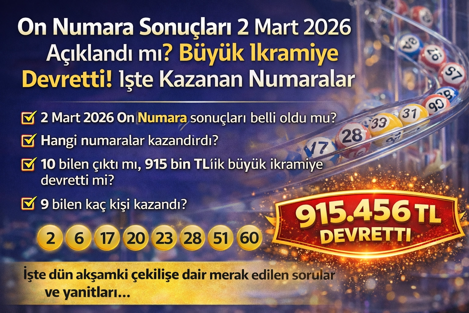 10 BİLEN ÇIKTI MI? BÜYÜK İKRAMİYE DEVRETTİ2 Mart 2026 tarihli On Numara çekilişinde: 10 bilen çıkmadı.Büyük ikramiye olan 915.456,60 TL devretti.9 bilen 15 talihli, kişi başı 32.509,65 TL kazandı.8, 7 ve 6 bilen talihliler de diğer ikramiyelerin sahibi oldu.Büyük ikramiyenin devretmesiyle birlikte gözler bir sonraki çekilişe çevrildi.