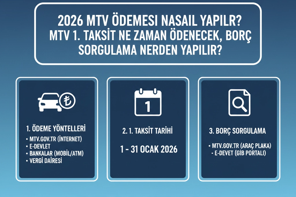 MTV 1. TAKSİT ÖDEME TARİHİ2026 yılı Motorlu Taşıtlar Vergisi 1. taksit ödemeleri 2 Ocak 2026 itibarıyla başladı ve 2 Şubat 2026 Pazartesi günü sona erecek. Bu tarihe kadar ödemelerin yapılmaması durumunda gecikme faizi uygulanacak.