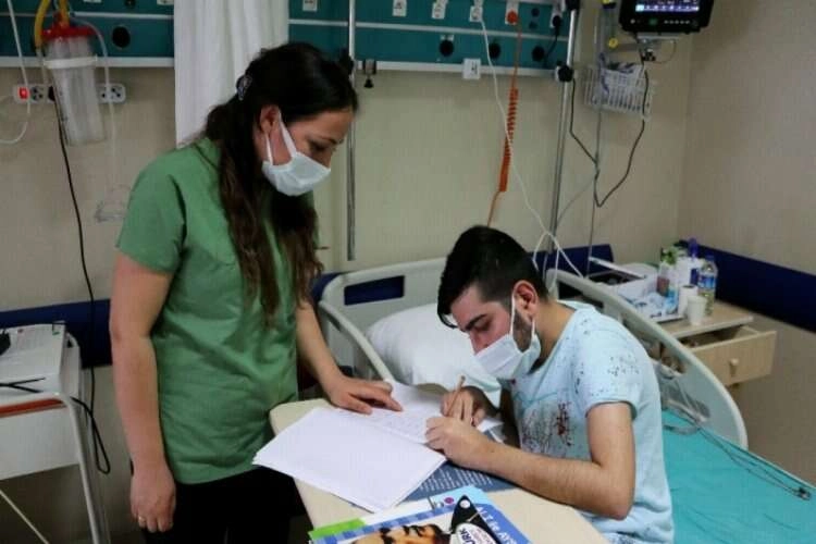 Adana’da yoğun bakımda tedavi gören ve okuma yazma bilmediği öğrenilen 23 yaşındaki Emrullah’a, hemşire Dilek Serin okuma ve yazma öğretti. Emrullah’a kırmızı kurdelesini de takan Serin, “Ben çok duygulandım. Bir insana dokunabilmek çok önemli. Bunu yaşayarak hissettim” dedi.