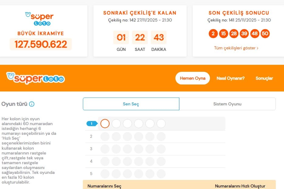 25 Kasım Süper Loto sonuçları:25 Kasım 2025 Süper Loto çekilişinde büyük ikramiye devretti. Kazandıran numaralar ve kategori bazlı ikramiye tutarları Milli Piyango Online üzerinden görüntülenebiliyor. Bu haftanın devreden büyük ikramiye tutarı: 127.590.621,76 TL