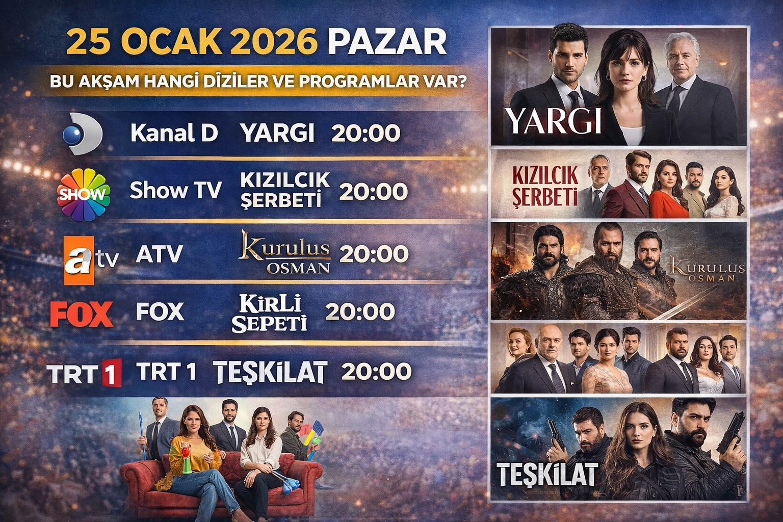 25 Ocak 2026 Pazar günü televizyon izleyicileri için zengin bir yayın akışı var. Ulusal kanallar, diziler, magazin programları, haber bültenleri ve yarışma programlarıyla izleyicilere farklı seçenekler sunuyor. Bu akşam TRT1’de Teşkilat, Kanal D’de Beyaz’la Joker, Now TV’de Sahtekarlar’ın yeni bölümü ekranlara gelecek.