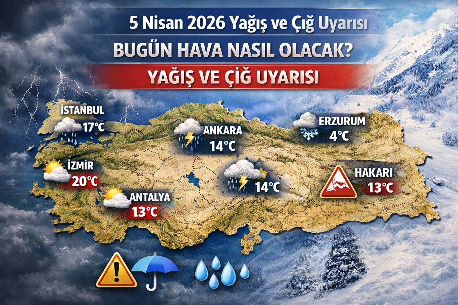 Meteoroloji Genel Müdürlüğü’nün son değerlendirmelerine göre, Türkiye genelinde 5 Nisan 2026 Pazar günü hava durumu oldukça hareketli olacak. Ülkemiz genelinin çok bulutlu geçmesi beklenirken, Ege, Akdeniz, İç Anadolu, Karadeniz (Zonguldak hariç), Doğu ve Güneydoğu Anadolu ile Balıkesir’in doğusu, Sakarya, Bursa ve Bilecik çevrelerinde yağış öngörülüyor.