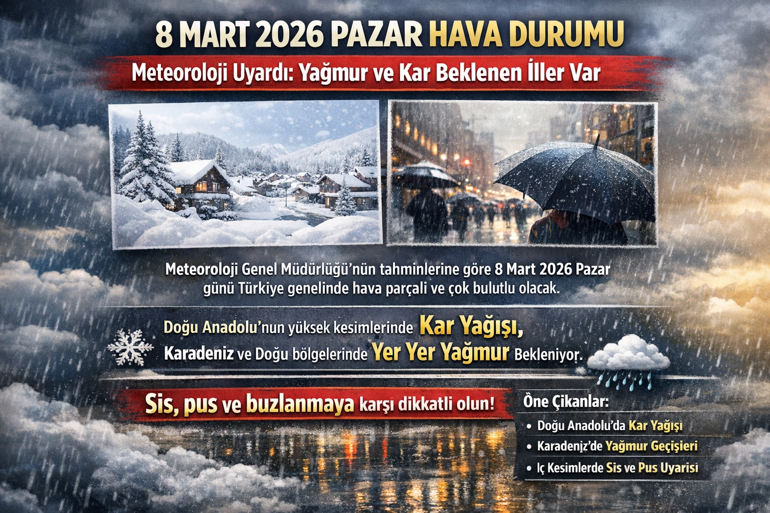8 MART 2026 HAVA DURUMU TAHMİNLERİMeteoroloji Genel Müdürlüğü tarafından yayımlanan son hava durumu raporuna göre Türkiye’nin kuzey ve doğu kesimlerinde yağışlı hava etkili olacak. Orta ve Doğu Karadeniz kıyıları, Doğu Anadolu’nun güneydoğusu ve Güneydoğu Anadolu’nun doğusunda yağmur, karla karışık yağmur ve kar yağışı bekleniyor.