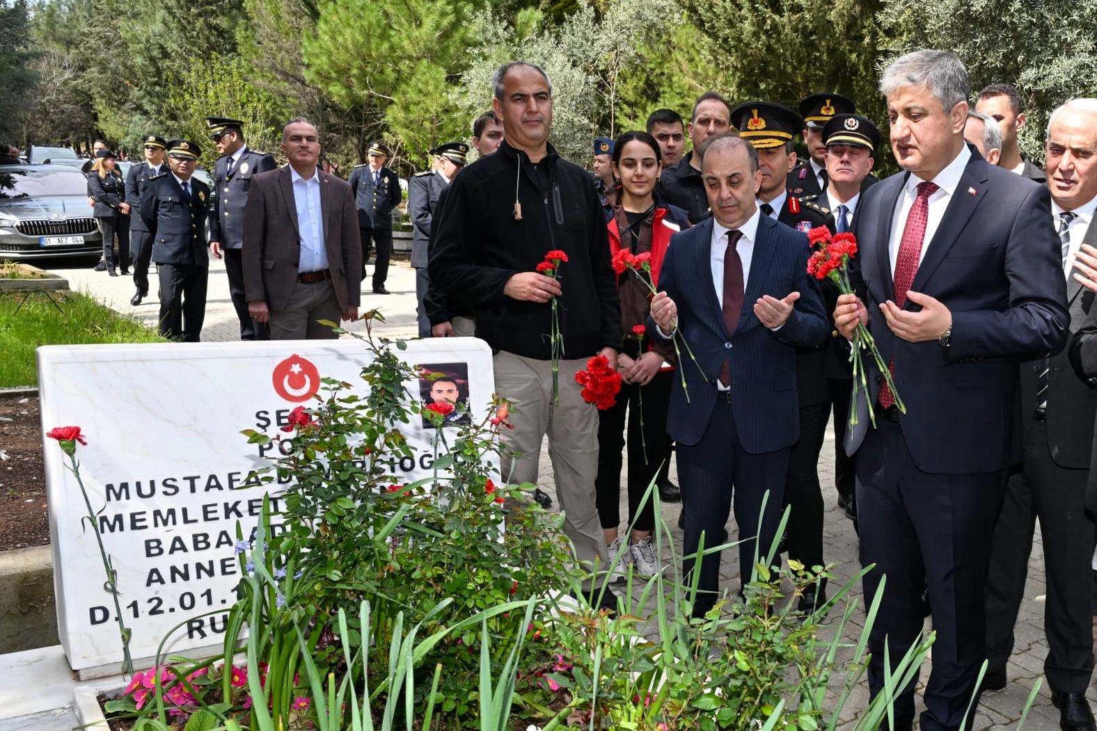 Tören, İstiklal Marşı’nın okunması ve saygı duruşuyla başladı. Ardından Kuran okunarak dualar edildi ve şehit kabirlerine karanfil bırakıldı.