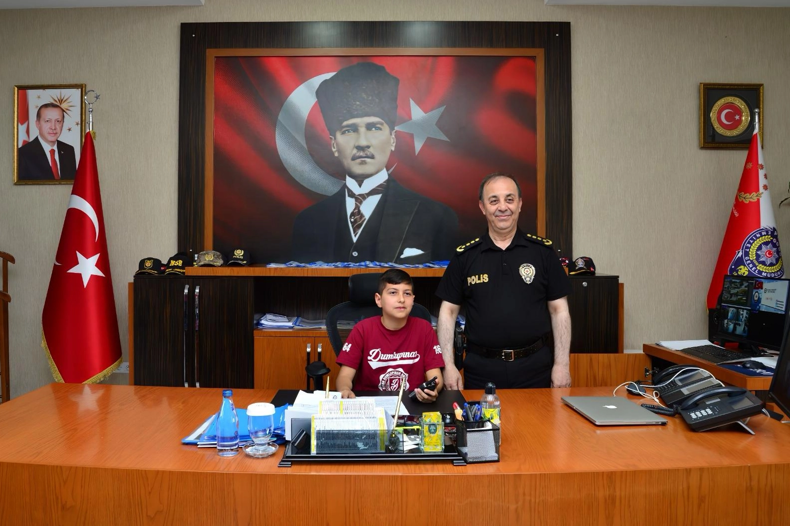 23 Nisan Ulusal Egemenlik ve Çocuk Bayramı, Türkiye genelinde olduğu gibi Adana’da da büyük bir coşkuyla kutlanıyor. Etkinlikler kapsamında, Adana İl Emniyet Müdürü Ahmet Hakan Arıkan, makamını Dumlupınar Ortaokulu 5. sınıf öğrencisi Sezai Odabaşı’na devretti. Sınıf arkadaşları ve öğretmenleriyle birlikte İl Emniyet Müdürlüğü’nü ziyaret eden Odabaşı, makam koltuğuna oturduktan sonra polis telsizinden yaptığı konuşmada, “Bizler, Polis Teşkilatı olarak, başta çocuklar olmak üzere halkımızın huzur ve güvenliği için bu görevi yerine getiriyoruz. Çalışmalarımızın merkezinde çocuk ve gençlerimiz var. Çünkü çocuk ve gençler, Mustafa Kemal Atatürk’ün de dediği gibi ülkemizin ve tüm insanlığın geleceğidir” dedi.