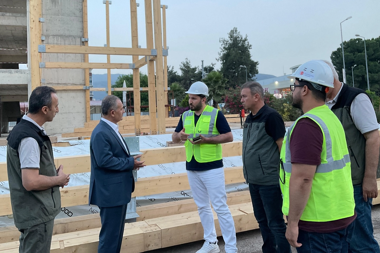 Tahsin Etli, Osmaniye İşletme Müdürlüğü hizmet binası ve lojmanlarının ahşap taşıyıcı sistemli yapım çalışmaları ile ilgili bilgiler aldı.
